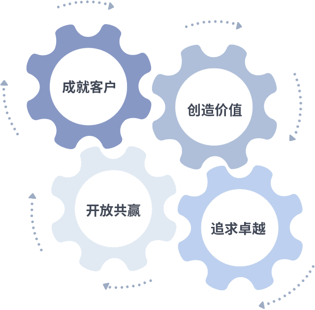 成就客户是一切决策的出发点,,,创造价值是衡量所有工作的标准,,追求卓越是我们做事做人的态度,,,开放共赢是我们的格局也是最终的结果。。价值观的齿轮环环相扣,,,推动着组织里的每个人不断向前。。。